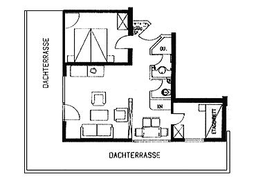 ca. 70 qm, ein Wohnschlafraum, Sitzecke mit Schlafcouch für 2 Personen, abgeteilte Kochnische und Eßplatz, ein Schlafzimmer mit 2 Einzelbetten, ein Schlafzimmer mit 1 Etagenbett, Dusche, separates WC. Lage: Staffelgeschoß, Terrasse Süd- und Westseite mit Meerblick. |